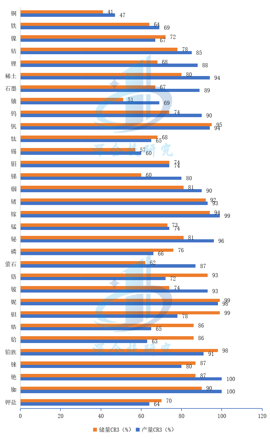 跟着全球数字经济、洁净能源(核电、风电、光伏、储能、氢能)、电动汽车财产迅猛成长,相关的原料、矿产主要性凸显,特别是洁净能源上逛矿产普遍进入环节矿产范畴之中。国际能源署(IEA)指出洁净能源普遍利用的沉点矿物包罗钴、铜、锂、镍、稀土元素(包罗钕、镝、镨、铽、钪、钇等17种金属元素),其他矿物包罗砷、硼、镉、铬、镓、锗、石墨、铪、铟、铱、铅、镁、锰、钼、铌、铂、硒、硅、银、钽、碲、锡、钛、钨、钒、锌、锆。洁净能源环节矿产需求迅猛增加。按照国际能源署(IEA)正在2022年的预测,若要正在2050年实现全球碳中和的方针,全球能源转型程序需要进一步加速,可再生能源行业将成为锂、镍、钴、铜、稀土元素的最大消费部分,估计2040年全球环节矿产需求将比2020年增加6倍多,此中锂需求将增加40多倍,石墨、钴和镍的需求约增加20~25倍,铜的需求将会加倍,电动汽车和储能电池的金属需求正在2040年将会至多添加30倍。环节矿产次要分布正在少数资本富集的国度。环节矿产的全球分布极不服均,富集于少少数国度。大型矿产投资周期长,从勘察、扶植到投入利用凡是需要十余年时间,矿物供给增加迟缓。矿产分布不均、供应欠缺导致环节矿产的计谋主要性凸显,矿产资本国正在全球矿产供应链中的影响力和话语权显著提拔,激发资本国新一轮资本平易近族从义以及次要经济体之间财产链节制力抢夺。以次要环节矿产的储量和产量(原生金属)份额集中度为例,前三国度储量占比(CR3)达到或跨越80%的环节矿产10余种,包罗稀土(约80%)、钒(95%)、铟(81%)、锗(92%)、镓(94%)、铋(81%)、铬(93%)、铌(99%)、钽(99%)、锆(86%)、铪(86%)、铂族(98%)、铼(87%)、铯(87%)、铷(90%)等;产量CR3达到或跨越80%的环节矿产约20种,包罗钴(85%)、锂(88%)、稀土(94%)、石墨(89%)、钨(90%)、钒(94%)、锑(80%)、铟(90%)、锗(93%)、镓(99%)、铋(96%)、萤石(87%)、铍(93%)、铌(98%)、铂族(91%)、铼(80%)、铯(100%)、铷(100%)等。做为大商品的环节矿产中,铜、铁、镍、铬、锰、锡等分布也较为集中。铜的储量和产量CR3别离为41%、47%,铁的储量和产量CR3别离为64%、69%,镍的储量和产量CR3别离为72%、67%,铬的储量和产量CR3别离为93%、72%,锰的储量和产量CR3别离为73%、74%,锡的储量和产量CR3别离为57%、60%。